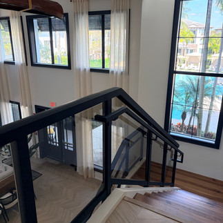 At Cypress Creek Residential, these custom framed glass railings bring together structure and style in all the right ways. Designed with precision-fabricated aluminum frames and laminated glass panels, the system delivers a clean architectural look while maintaining full safety compliance for stairs and upper-level walkways.